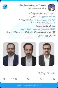#محمد_اصغری کد انتخاباتی : ۱۱۱#رضا_حسنی_شیر_کوهی کد انتخاباتی : ۱۱۳#مهیار_فرنیا کد انتخاباتی : ۱۱۷انتخابات بازرسان سازمان #نظام_مهندسی_‌ساختمان_استان_تهران📅 نوبت دوم سه‌شنبه ۱۳ آبان ۱۴۰۴ – ساعت ۱۲ ظهر – سالن همایش وزارت کشور